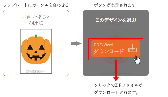 テンプレートにカーソルを合わせた際、表示されるオレンジのボタンをクリックすると、ZIPファイルのダウンロードが開始します。ZIPファイル内のPDF、Wordをご利用ください。PDFはすぐにデザインを印刷したい方に、Wordは編集を加えたい方にオススメです。