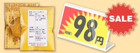 店頭の販促用POPや値段表示、食品関連表示ラベルを揃えています。